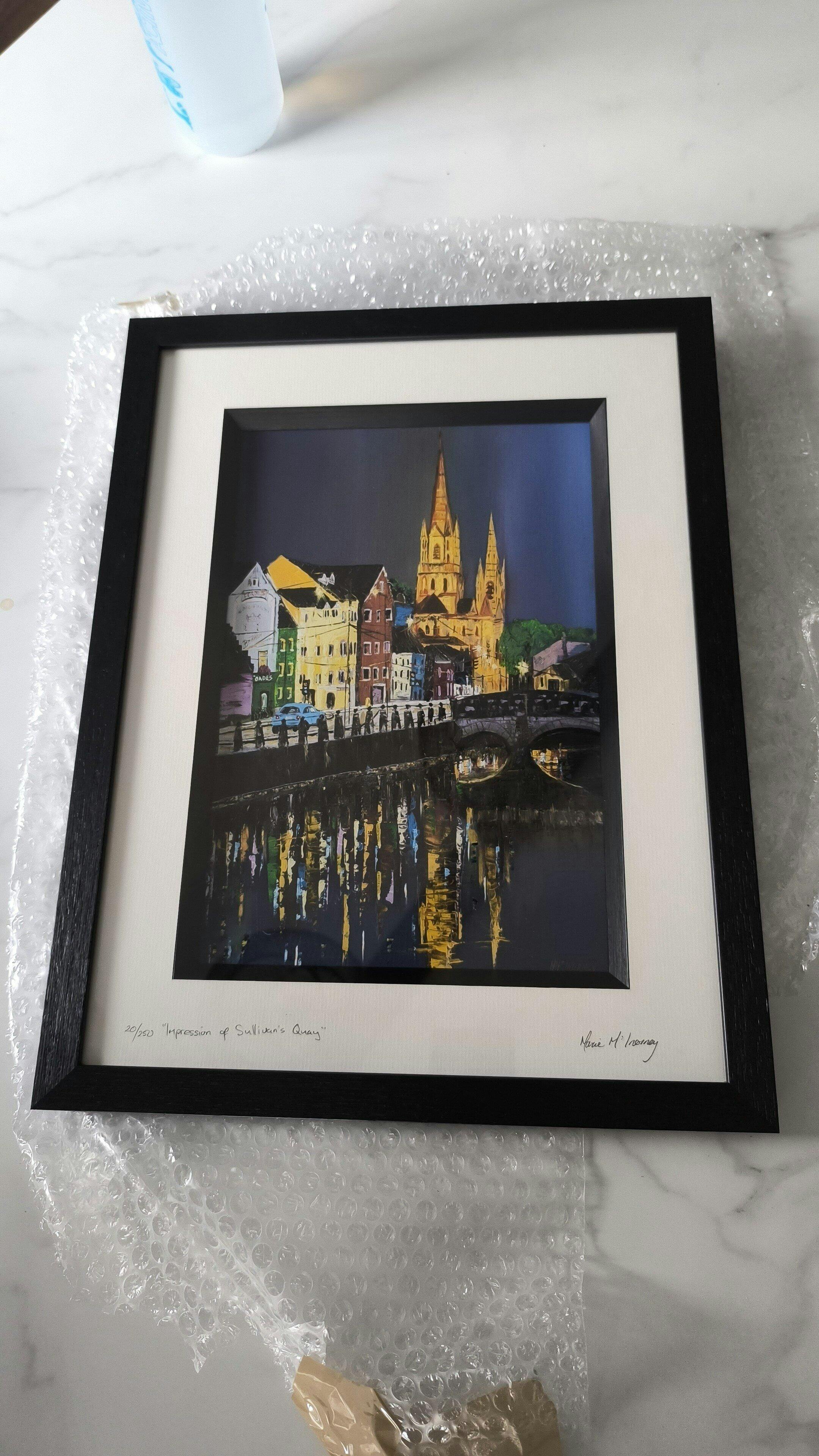 A Limited edition Cork City print featuring vibrant reflections on the River Lee. A high-quality reproduction of my original painting, showcasing Cork’s historic charm in a contemporary impressionist style. Signed and numbered.