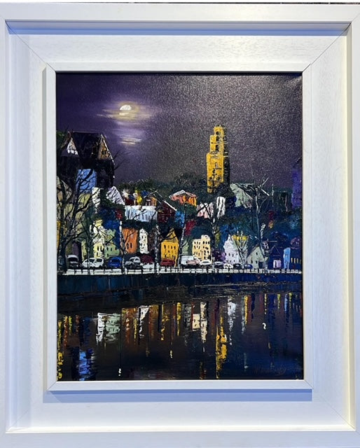 This is one of my 'Impression' series. Cork City is an ancient city with wonderful historical buildings. Shandon Bells or locally known as (The Four Faced Liar, as supposedly none of the Clock Faces tell the same time). The streets reflection on the River Lee allows for a dramatic use of colour which I am really enjoying. The street and building are easily recognisable but my use of strong bold colours gives a sense of the character of the city. This was painted over the Jazz Weekend and I think there is a sense of movement and music about this painting.