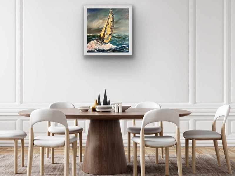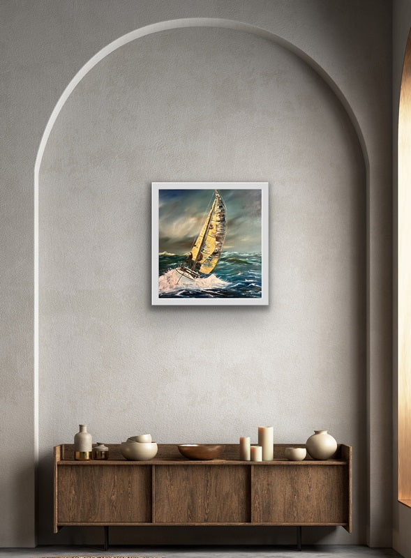 If you’ve ever sailed through high winds and rough seas, you’ll know the exhilaration — the wind in your hair, the spray of saltwater on your face, and the rush of cutting through waves. This original oil painting captures that powerful feeling.