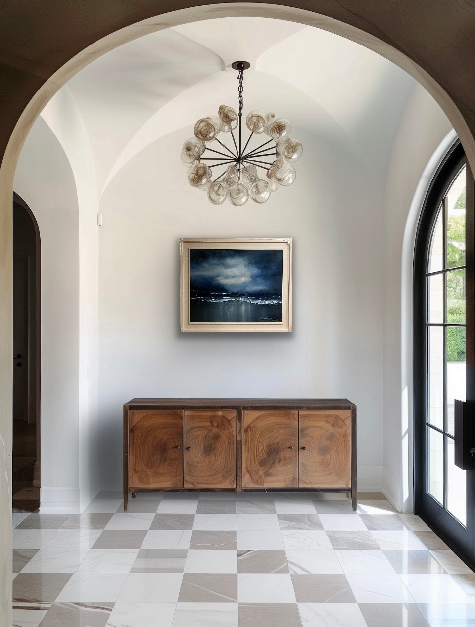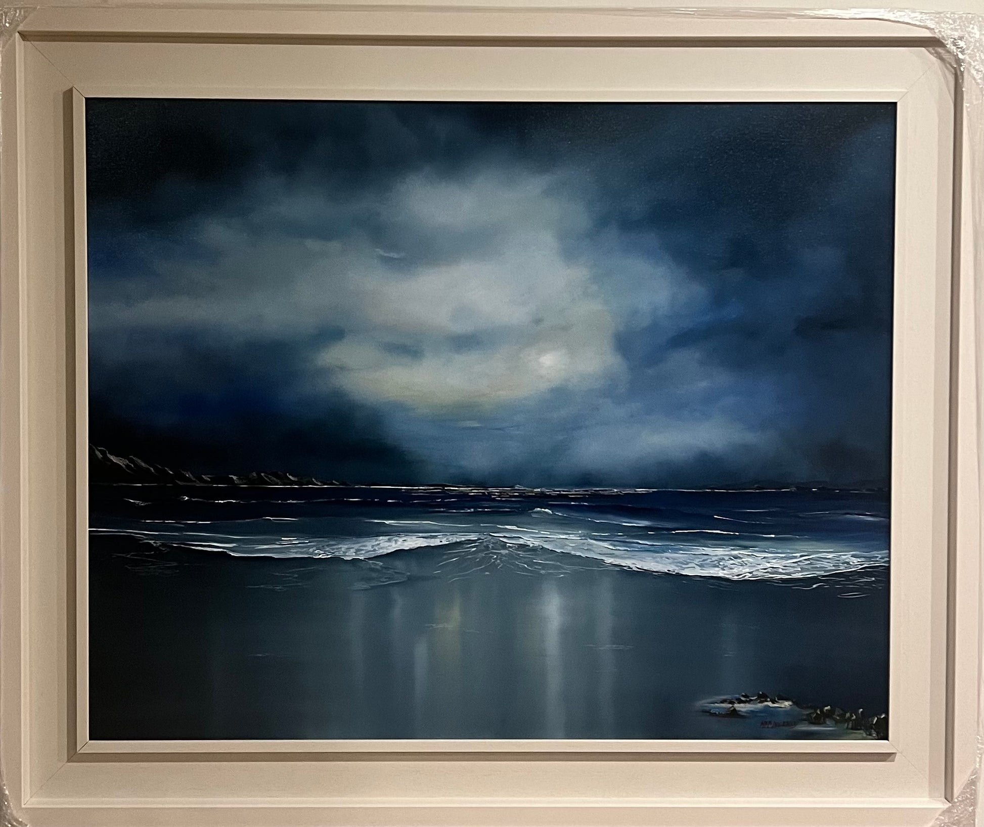 Rip Tide Reflections (108 × 88 cm) captures a quiet moment between sea and sky, where brooding clouds are mirrored in the wet sand below. Subtle light breaks through the darkness, suggesting calm and reflection after movement and change. A contemplative coastal piece that invites stillness and slow looking.